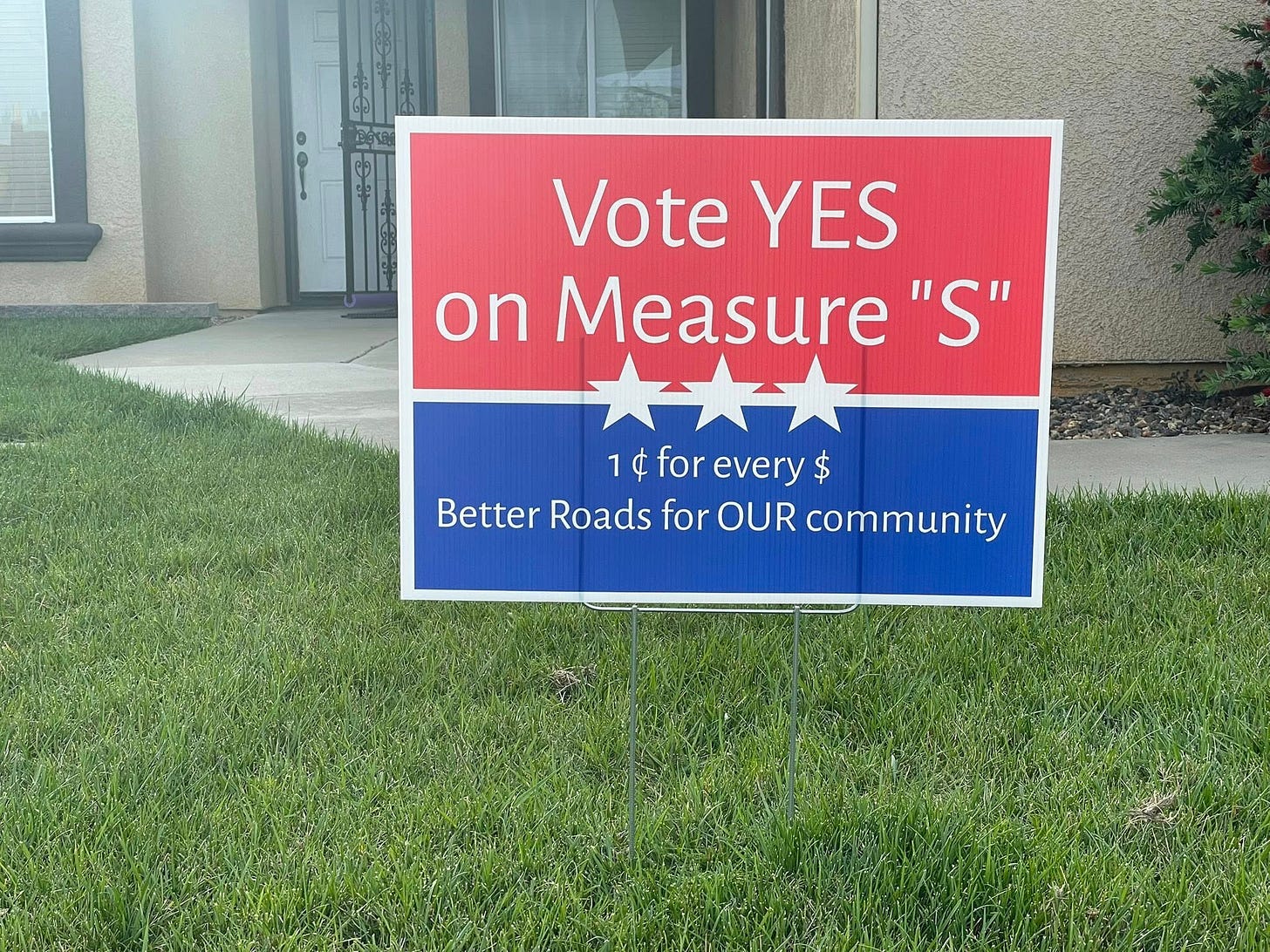 You probably recall another Citizens Initiative that recently got onto the June primary ballot for a one cent tax to fix the streets in Red Bluff. A grassroots group of citizens did the legwork and got the sigs necessary to get Measure S onto the ballot for the people to vote on. No easy task.